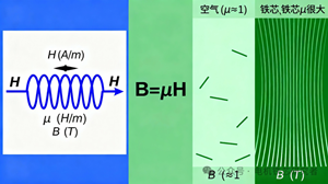 注:核心公式B=μH。左側(cè)線圈通電產(chǎn)生磁場強(qiáng)度H(外部驅(qū)動力),中間不同材料的磁導(dǎo)率μ決定響應(yīng)效率,右側(cè)產(chǎn)生的磁感應(yīng)強(qiáng)度B(實(shí)際磁化效果)大小不同。相同H下,高μ材料產(chǎn)生的B更強(qiáng),磁通Φ更大。